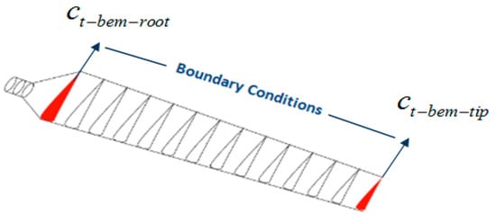 The two values of the tangential force coefficient at the root and tip profile constitute the boundary conditions for the PGD algorithm Figure 2, which will be used just to initiate the computation. The numerical procedure will then generate the parameterized Ct solutions along the radial length of the blade. The blade will be estimated in 24 elements in terms of BEM, and each element will be estimated at 104 nodes in terms of PGD, which means for each dimensions r, h, and w, we attribute 24 × 104 nodes. The nodal refinement allows us to have the solution very close to the first node at the root and the last node at the tip. To this effect, we just have to swap the solution at the edge node with the solution at the closest node at the tip and root to have new solutions at the edges.