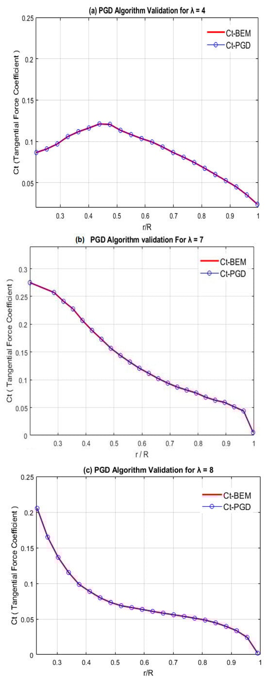 To the best of our knowledge, there is no study that has employed PGD to optimize the blade profile along the spanwise direction from an aerodynamic perspective. Therefore, this paper intends to present a new approach to optimize the blade profile of HAWT for certain initial conditions. A combination of BEM and PGD algorithm is incorporated into MATLAB (R2010A) to optimize the turbine blade profiles along the blade span. This study presents a methodology that combines the PGD method with the BEM approach for the optimization of the blade profiles for the purpose of maximum power production. The PGD method gives a parametric solution, and the user can obtain the required solution by selecting specific parameter values. These values are selected initially from the BEM method and are then used in the PGD model to find the solution. Additional factors such as airfoil thickness, , and twist angle are also considered in order to ensure that the design is both optimized and realistic. This approach integrates the strengths of both PGD and BEM, offering a versatile and efficient framework for aerodynamic optimization that can be utilized in designing high performance blades.