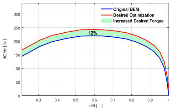 - Since we have our PGD tool to have a parameterized solution calibrated and ready for use, it suffices simply to query our tool by injecting the optimal values of and maximizing the torque in order to obtain the desired solution of . There are several possible ways to maximize the torque, we will proceed by the most intuitive approach which consists of preserving the shape distribution of the span-wise torque for an optimal design value of tip-speed ratio, while increasing its values for each element blade. Maximizing the torque by modifying its derivative involves translating the torque graph along the y-axis to increase the area between the torque curve derivative and the (r/R)-axis.