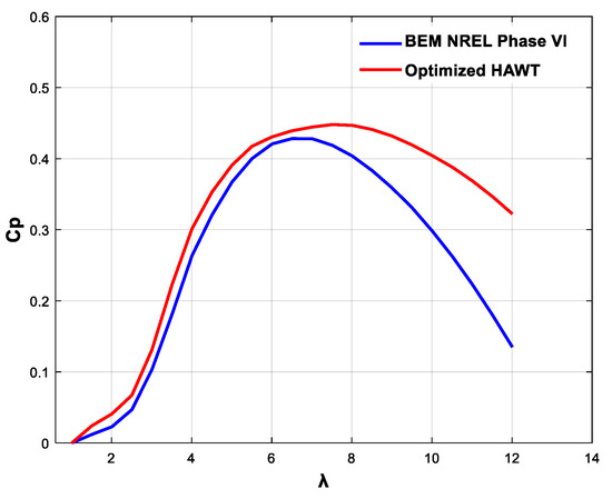 The characteristic curves depicted in Figure 11, show that the power coefficient of the optimized rotors is higher than that of the reference turbine for TSR range from 1 to 12, with an increase of 21.7% to the reference turbine NREL Phase VI power coefficient. The fact that the optimized rotors perform better than the reference turbine over a range of TSR values suggests that the optimization is valid for multiple scenarios. This means that the optimized rotor design is not only effective under certain conditions but also has broad applicability across different wind conditions. Overall, a 21.7% improvement in power efficiency and the broad applicability of the optimized design are both positive indications that the optimization process was successful and has the potential to lead to more efficient wind turbines configurations. The PGD code used was launched with parameters determined by the BEM algorithm and validated by it. Therefore, the blade that we have optimized satisfies the assumptions of BEM theory that the blade operates in the linear part of the lift characteristic and does not account for dynamic stall explicitly. This study presents a PGD-based optimization approach and it is shown how it can be applied as a case study by coupling with BEM to demonstrate the flexibility of our variable separation tool for a wide range of other possible applications. To enhance the accuracy of the results, users can make their own assumptions based on the particular case they are studying. Therefore, we consider our optimized blade to be a valid design in the context of BEM assumptions.