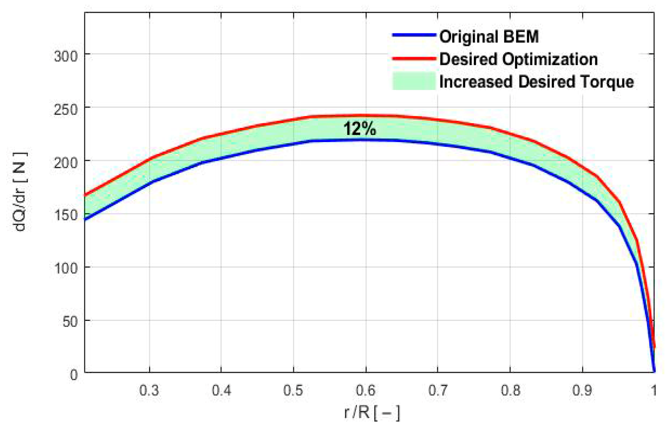The process of shifting the graph involves translating the original elementary torque (torque per length unit) graph upwards along the y-axis by a certain distance. The amount of translation needed is determined by the condition that the area between the shifted and original dQ/dr graph must be 12% of the area between the dQ/dr graph and the r/R-axis. This condition ensures that the shift is significant enough to have a noticeable effect on the torque and, consequently, on the power. Once the translation is completed, the shifted graph is plotted alongside the original graph to provide a visual representation of the shift. Since The PGD tool enables the parameterization of the target , the resulting curve will be used as a control parameter in the proposed PGD algorithm to analyze and optimize the wind turbine blade according to the tangential force coefficient values.
