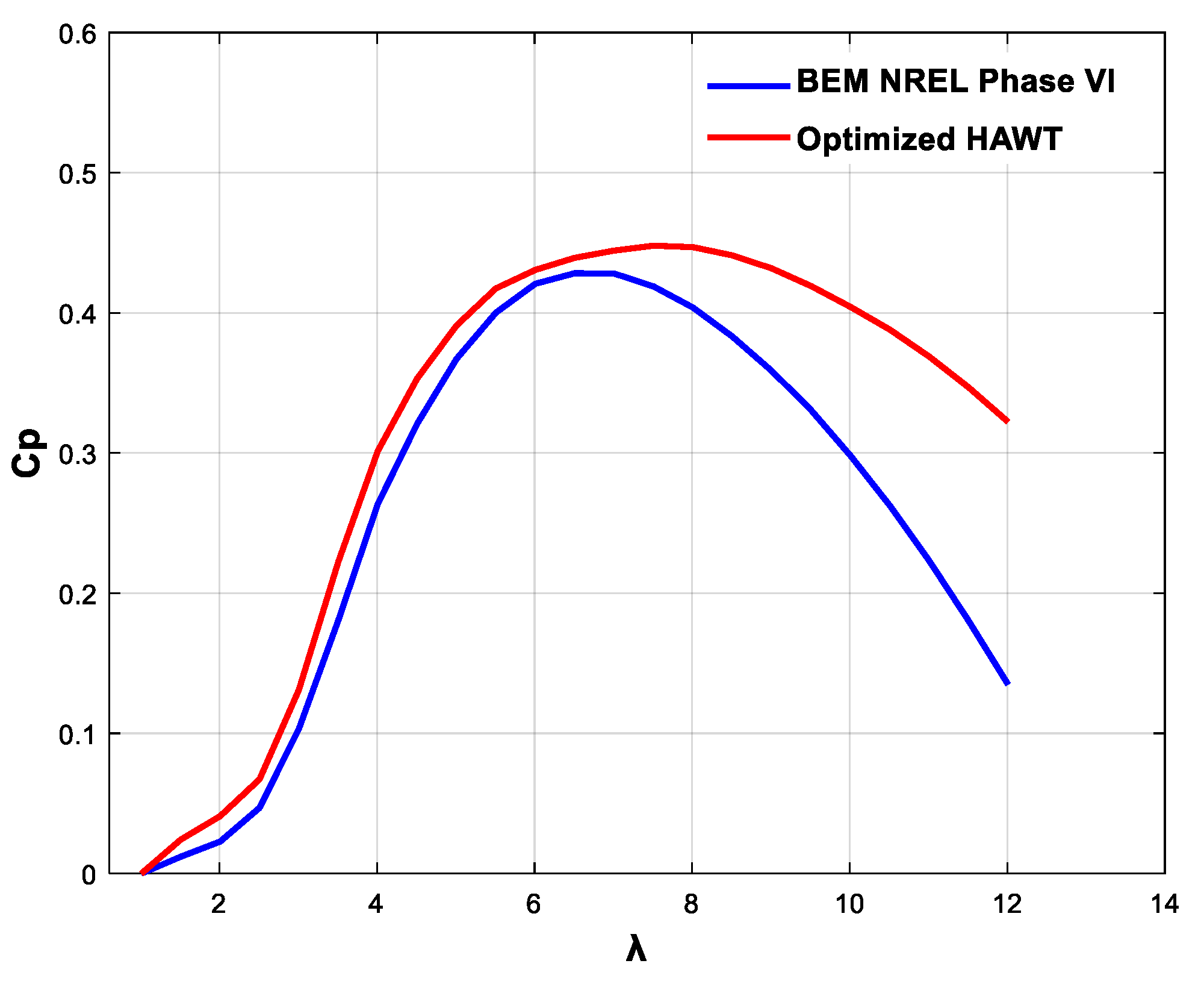 Figure 11, show that the power coefficient of the optimized rotors is higher than that of the reference turbine for TSR range from 1 to 12, with an increase of 21.7% to the reference turbine NREL Phase VI power coefficient. The fact that the optimized rotors perform better than the reference turbine over a range of TSR values suggests that the optimization is valid for multiple scenarios. This means that the optimized rotor design is not only effective under certain conditions but also has broad applicability across different wind conditions. Overall, a 21.7% improvement in power efficiency and the broad applicability of the optimized design are both positive indications that the optimization process was successful and has the potential to lead to more efficient wind turbines configurations. The PGD code used was launched with parameters determined by the BEM algorithm and validated by it. Therefore, the blade that we have optimized satisfies the assumptions of BEM theory that the blade operates in the linear part of the lift characteristic and does not account for dynamic stall explicitly. This study presents a PGD-based optimization approach and it is shown how it can be applied as a case study by coupling with BEM to demonstrate the flexibility of our variable separation tool for a wide range of other possible applications. To enhance the accuracy of the results, users can make their own assumptions based on the particular case they are studying. Therefore, we consider our optimized blade to be a valid design in the context of BEM assumptions.