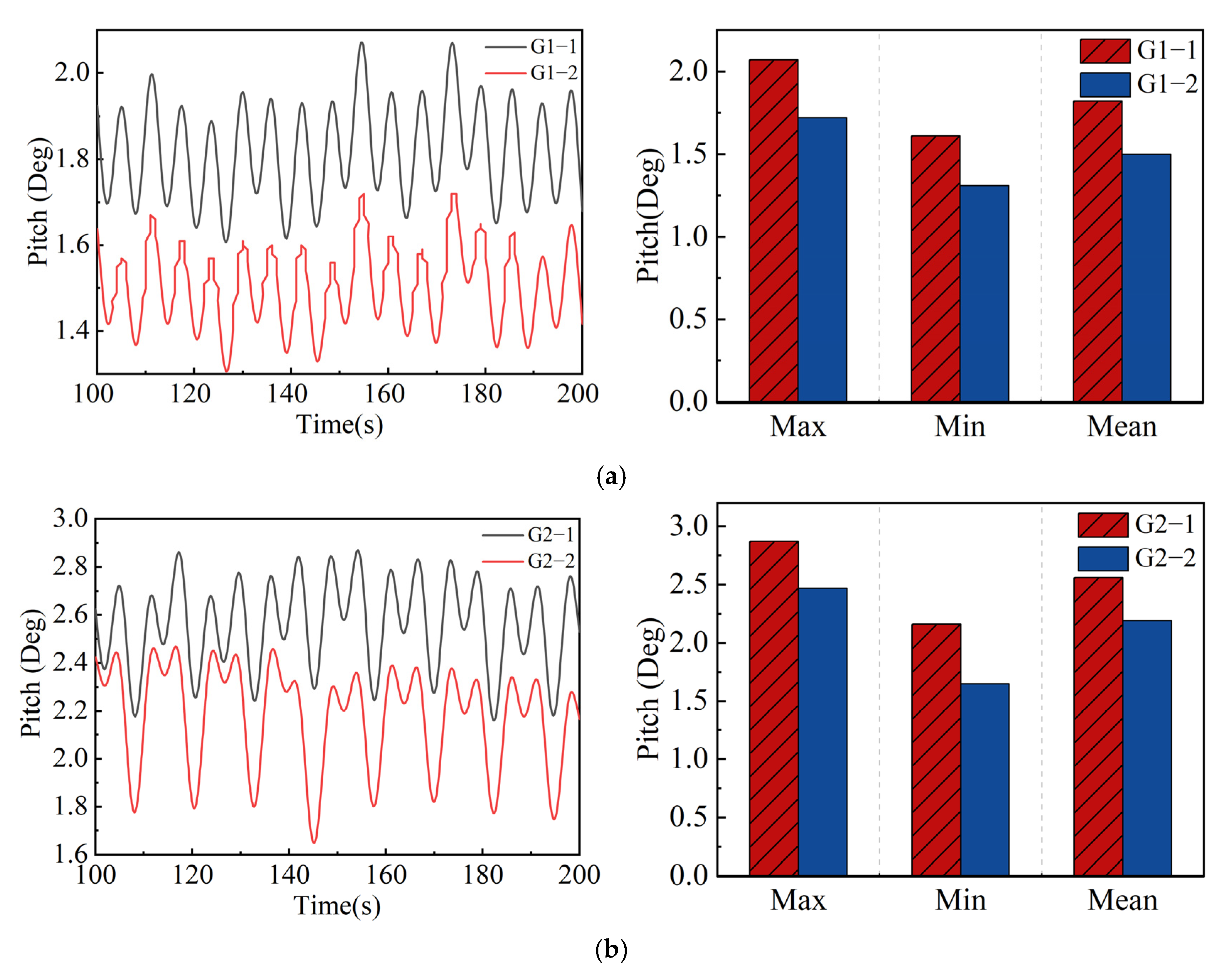- Under rated wind–wave conditions, the double- configuration significantly reduces pitch responses induced by rotor gyroscopic effects. In extreme sea states, the peak pitch angle is reduced by approximately 22%, accompanied by a notable decrease in axial loads, demonstrating that the double- structure effectively attenuates the amplification of the platform instability caused by gyroscopic moments.