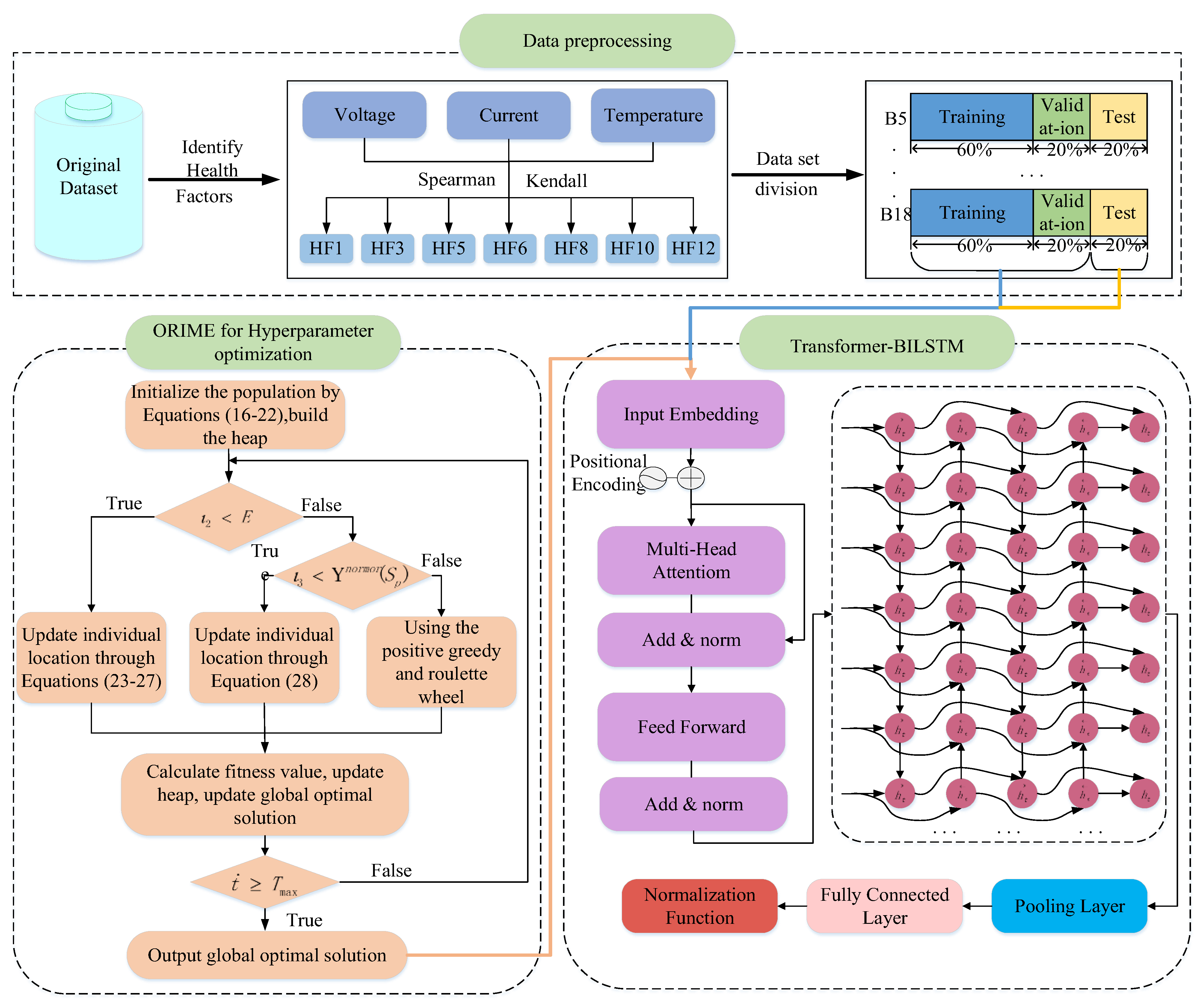 - Fusion model: Traditional single models have difficulty capturing long-distance dependencies when dealing with time series data, resulting in low prediction accuracy. This paper integrates the Transformer encoder and BILSTM and proposes the ORIME–Transformer–BILSTM model that combines global search and deep mining, which can quickly and accurately capture the features and intrinsic correlations of key health indicators in battery time series data.