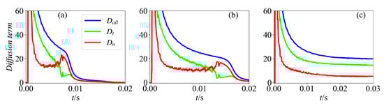 Temporal evolution of tangential diffusion and normal diffusion for H2O molecule for various ignition energies: (a) = 5.2 J/m, (b) = 5.5 J/m, and (c) = 5.8 J/m.
