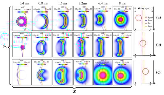 Temporal evolution of HRR field for fixed = 0.5 mm, = 0.6 ms, = 5.8 J/m, and = 5 but different positions of ignition; the spark is placed at (a) = 0.012 (lean mixture), (b) = 0.142 (), and (c) = 0.298 (rich mixture) (units: HRR: J/m3/s). Here, the blue, red, and yellow lines represent , , and , respectively. The schematic diagrams on the right show the initial location of the spark.
