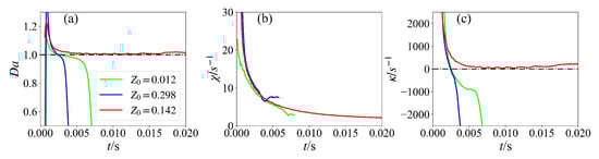 In Figure 8, for the case with = , the scalar dissipation rate is larger, and the ignition process is more susceptible to dissipative loss of heat and radicals, resulting in quick flame quenching. Meanwhile, the corresponding Damköhler number of this case becomes less than unity, and the value of the flame stretch also changes from positive to negative. A similar process occurs for the case with = 3. It is interesting to observe that the profile of scalar dissipation rate fluctuates evidently when the flame quenches. For the case with = 5, the profile of the scalar dissipation rate is smooth consistently. The Damköhler number of this case is always larger than unity, and the flame stretch maintains a positive value. It is suggested that a high scalar dissipation rate can locally weaken the reactions due to heat and species loss, and hence, the ignition is retarded. Low scalar dissipation rate, in contrast, allows the species and temperature to accumulate during the induction time, which leads to ignition. Overall, it is indicated that increasing the mixing layer thickness can promote ignition kernel development.