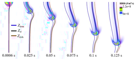 Figure 9 shows the evolution of the HRR for different cases. Compared to the case with the spark located at the iso-line of the stoichiometric mixture fraction (baseline case), the ignition becomes more difficult when the spark position is placed in the lean or rich mixture. This behavior is attributed to the spark’s mixture fraction coverage. The spark spans over a wide range in the mixture fraction space for the baseline case, and thus, the high temperature induced by the spark can ignite the mixture successfully. However, for the case with the spark placed in the lean/rich side, the heat generated by the spark first results in a high-temperature area; then, the ignition is unsuccessful due to the weak reaction rate.