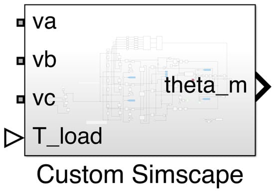 The first considered model is implemented as a Permanent Magnet Synchronous Machine block in the Electrical Machines folder of the Simscape/Electrical/Specialized Power Systems blockset of the MATLAB/Simulink application. The stator windings are connected in a star configuration with an internal neutral point. The library block is labeled by default as a “Permanent Magnet Synchronous Machine”, but it can represent a BLDC machine as well, provided that a trapezoidal back-EMF profile is selected. According to the manufacturer’s documentation, the three-phase model can support either a sinusoidal or a trapezoidal back-EMF waveform. The Permanent Magnet Synchronous Machine block can operate in generator or motor mode, depending on the sign of the mechanical torque (positive for motor operation, negative for generator operation). The electrical and mechanical components are modeled using second-order state space equations.