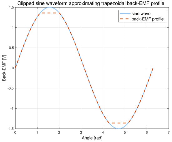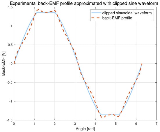 Experimentally determined back-EMF profile, corresponding to the rotational speed of 3000 rpm, approximated with a clipped sine waveform. The approximation is necessary since Model 1 (Specialized Power Systems) does not support tabulated EMF profiles.