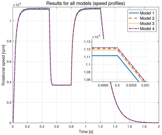 Figure 9 presents results of the first stage of simulation tests, where all models were provided with the back-EMF profile compatible with Model 1 (Specialized Power Systems), implemented as the Permanent Magnet Synchronous Machine library block. Four modes of operation have been applied in a sequence: soft-start, stepwise load application and removal, and dynamic braking. The computed responses of considered models differ slightly, but the difference does not exceed 1.5%.
