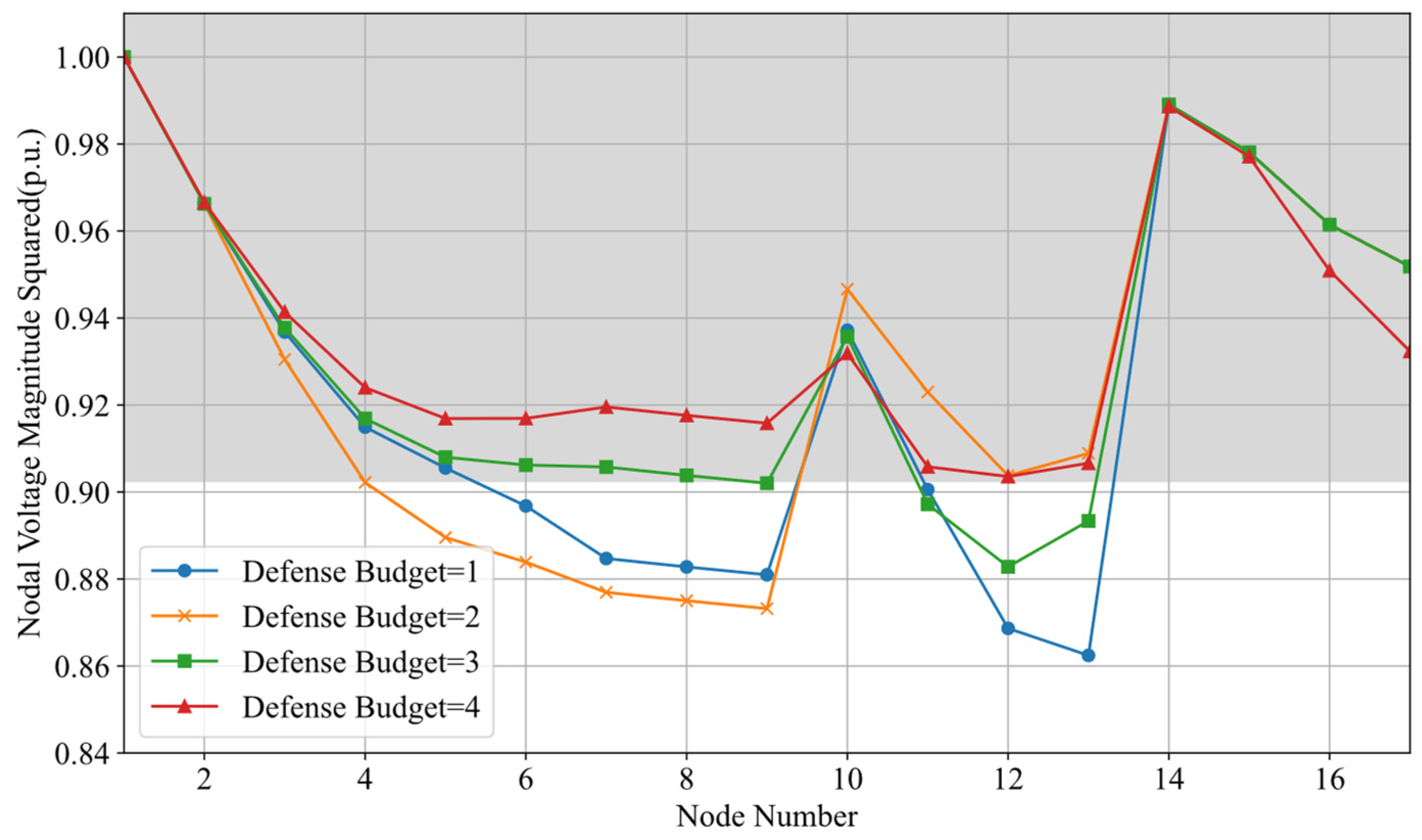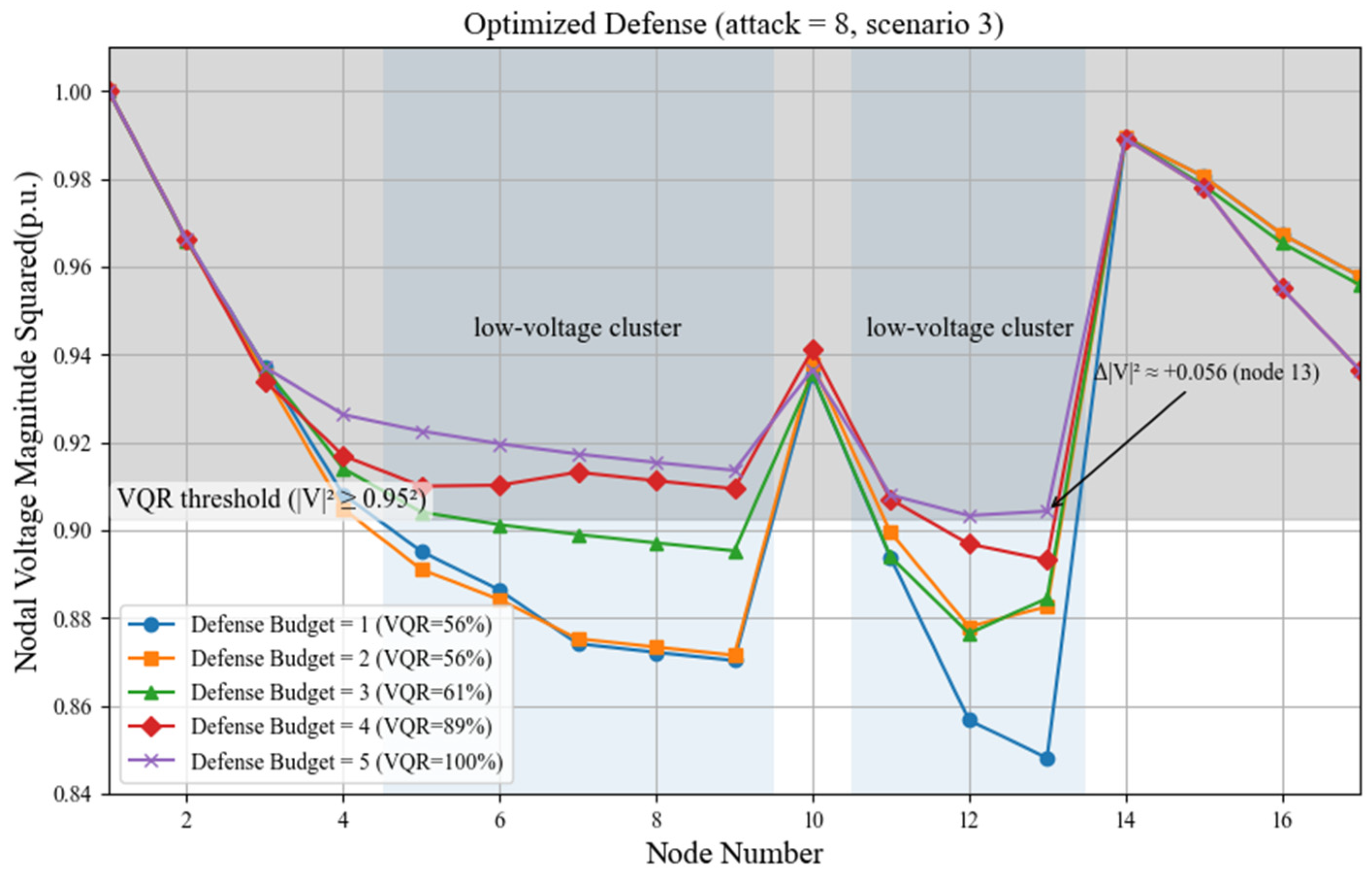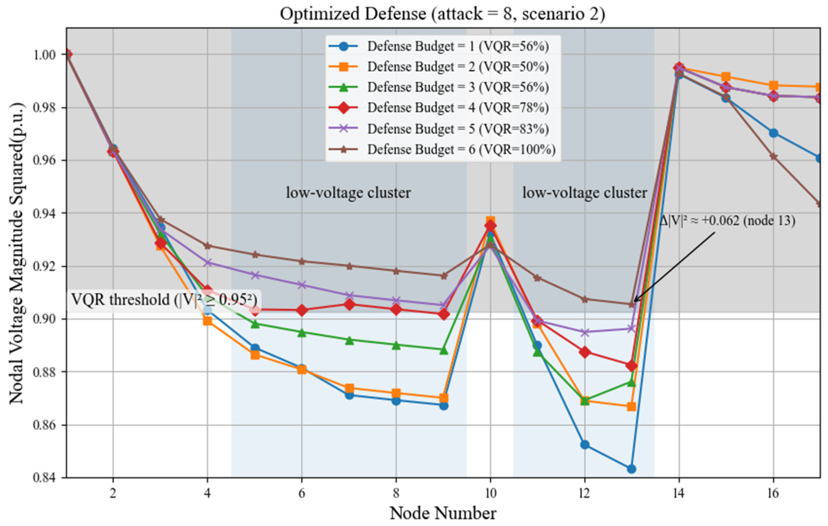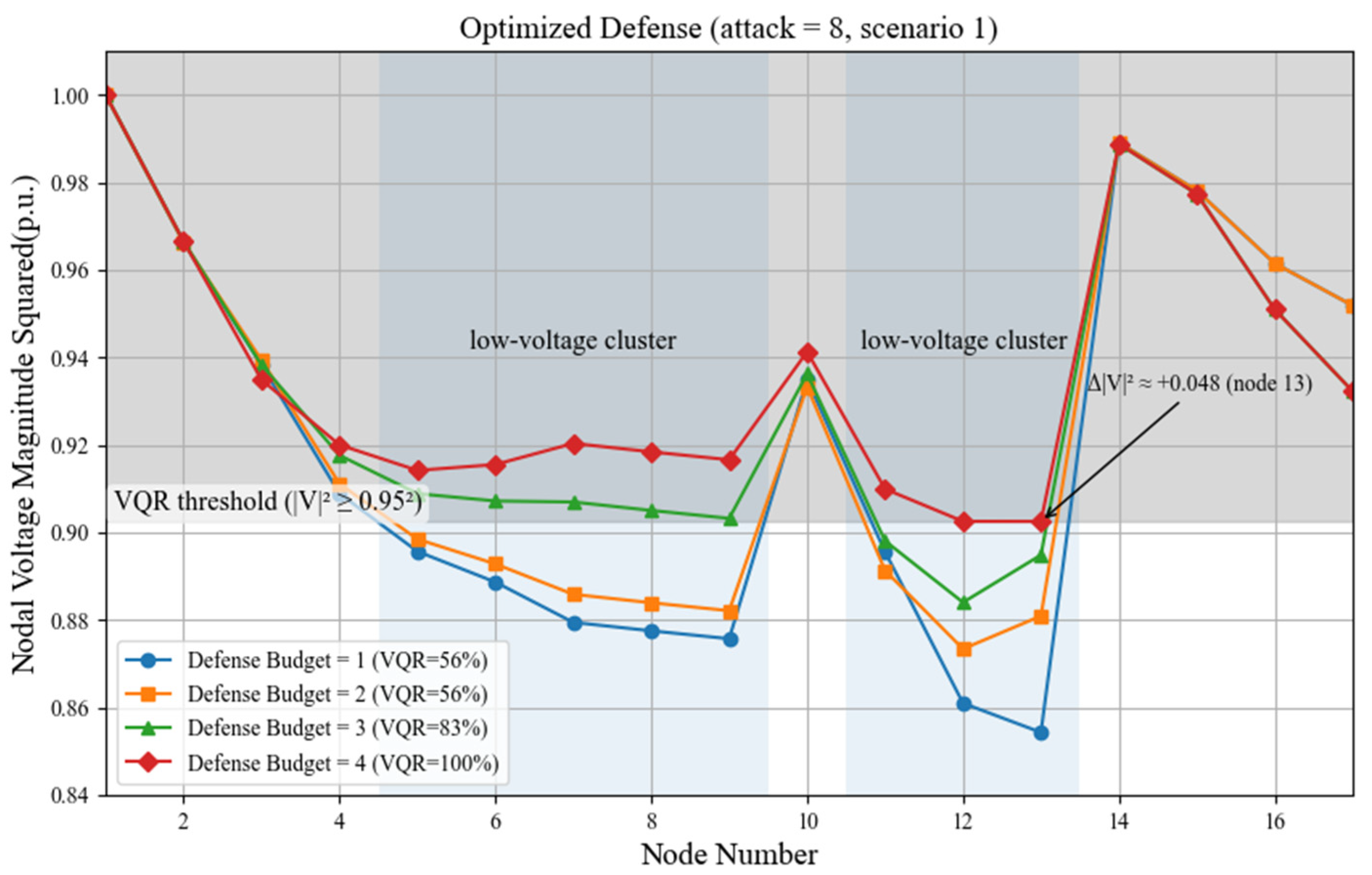 - We adopted three evaluation metrics—maximum voltage deviation (MVD), root-mean-square (RMS) voltage deviation, and voltage qualification rate (VQR)—to quantify the synergy between defense allocation and corrective operation, with effectiveness validated in simulation studies.