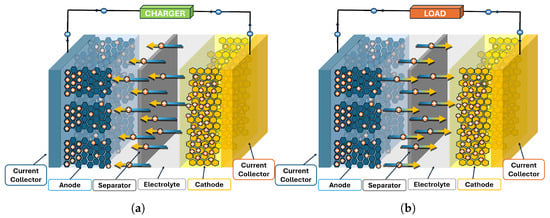 Lithium-ion batteries consist of four primary components: the anode and cathode (electrodes), a separator, and an electrolyte. Each of these parts plays a crucial role in defining the characteristics and overall performance of the battery. In a lithium-ion battery, the movement of lithium ions between the anode and cathode occurs during charging and discharging, a process referred to as intercalation and deintercalation. During discharging (deintercalation phase), lithium ions are released from the anode into the electrolyte, while electrons flow through an external circuit to generate usable electrical power. Concurrently, lithium ions are inserted into the cathode. This movement is driven by the concentration gradient of lithium ions, creating a potential difference that enables current generation. Conversely, during charging, lithium ions migrate from the cathode back to the anode, reversing the previous process. Figure 1a,b show the Li-ion motion, respectively, during the charge and discharge process. The electrolyte acts as the medium facilitating the movement of lithium ions between the electrodes. The separator is a barrier that prevents direct contact between the anode and cathode, thereby avoiding short circuits [25]. Overall, the working mechanism of lithium-ion batteries is characterized by the controlled movement of lithium ions and electrons, facilitated by carefully selected materials and design features to optimize performance and longevity.