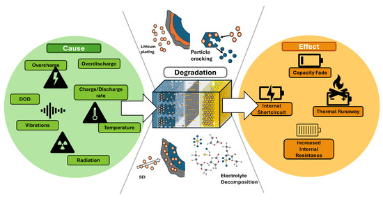 - Radiation: It can impact the cathode materials, resulting in an increase in grain size due to irradiation, enforcing the capacity loss. Furthermore, the radiation-induced electrolyte decomposition may also play a role in the degradation process. Experiments on Li-ion batteries show cathode grain coarsening and electrolyte decomposition under high irradiation, with capacity losses of up to 8–10% at doses of several Mrad [29,30]
