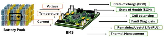 A Battery Management System is a vital technology responsible for monitoring and controlling the performance of battery systems [21]. BMS technology plays a crucial role in various applications, ranging from electric vehicles to renewable energy systems, portable electronics, and satellites. Although BMS configurations may differ depending on the application, their core functionalities ensure optimal operating conditions and stabilize battery operations by processing data from sensors and implementing control algorithms in real time [61]. The BMS enables the tracking of the SOC and SOH of batteries, diagnoses potential faults, manages thermal conditions, and balances cell charges by continuously analyzing voltage, current, temperature, and other parameters. Together, these features, summarized in Figure 3, ensure efficient energy use, enable predictive maintenance, and enhance the reliability and lifespan of batteries.