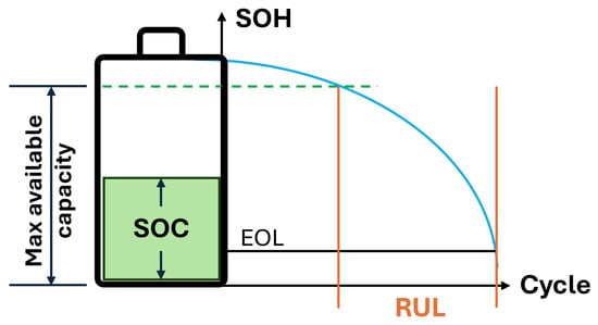 - Remaining Useful Life (RUL): The index refers to the number of charge/discharge cycles remaining until the battery reaches its end of life [21]. Continuous charging and discharging lead to capacity degradation, eventually requiring battery replacement when the capacity falls to 70–80% of its initial value [66]. Estimating RUL is critical for ensuring reliable and safe operation for proactive maintenance, minimizing unexpected breakdowns, and enhancing the overall lifespan of the battery system. A graphical representation of the RUL is reported in Figure 4.