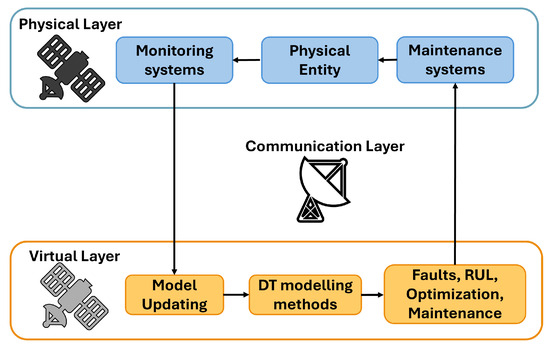 - The virtual layer is the digital replica of the physical entity, consisting of several models which replicate the state and behavior of the physical layer, using the recorded data for dynamic reconfiguration and model coupling [77]. The virtual component performs data processing and analysis, making it the intelligence core of the DT, enabling diagnosis, fault detection, and RUL prediction. Virtual models can be constructed using physics-based methods or data-driven models powered by Machine Learning (ML) and AI, which are essential for quick adaptation and analysis in data-rich environments [47,78].