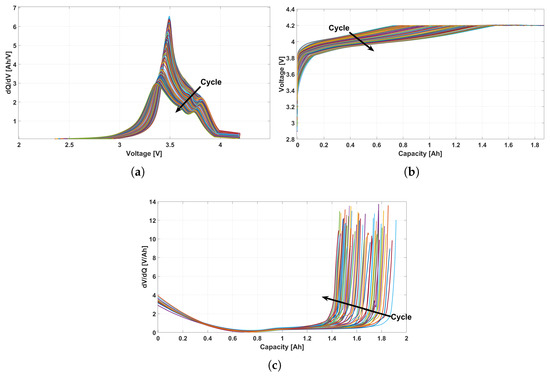 - Incremental Capacity Analysis (ICA) is valuable for diagnosing battery SOH by correlating peak features with battery capacity, particularly in high-current and random usage patterns [99,100]. In Figure 7a, the incremental capacity as a function of voltage shows the decreasing behavior of the curve as the number of cycles increases. The ICA’s dependence on low-noise, constant-current profiles limits real-world applicability. To counter this, methods such as model-free fitting and high current-rate adaptations enable ICA under noisy conditions, enhancing accuracy in Battery Management Systems [101,102,103,104,105].