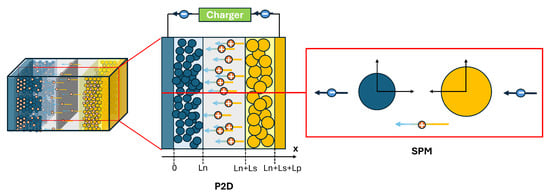 Representation of the Pseudo-Two-Dimensional (P2D) model and Single Particle Model (SPM).