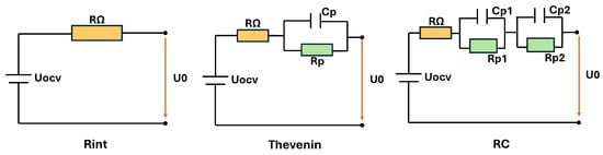Schematic representation of Equivalent Circuit Models (ECMs). The Rint model includes a resistor RΩ to represent the internal resistance. The Thevenin model adds an additional resistor (Rp) and capacitor (Cp) to account for transient effects. Finally, the RC model employs multiple RC branches to capture more complex transient dynamics [132].