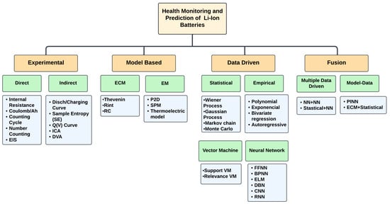 In [13], techniques, models, and algorithms used in lithium-ion battery state estimation and RUL prediction have been summarized, providing a comparison of various methods. In [14], a comprehensive analysis of various promising techniques to estimate SOH is systematically categorized and analyzed in terms of accuracy, advantages, disadvantages, and characteristics. Similarly, in [15], a classification of methodologies for estimating and predicting lithium-ion power battery SOH is proposed, dividing the methods into model-based, data-driven, and hybrid approaches, comparing the different SOH estimation and prediction methods. In contrast, ref. [16] provides a comparative analysis of signal-based SOH estimation techniques, categorizing them based on voltage, current, and thermal data, while also highlighting their performance metrics and limitations. In [17], a comprehensive review of current SOH prediction techniques conducted by systematically introducing the aging mechanisms of batteries is presented. The study begins with the aging mechanism of Li-ion batteries, analyzes the micro- and macro-level factors leading to battery aging. Other surveys have focused on advanced data-driven approaches. For example, a thorough classification of Artificial Neural Networks (ANNs) has been presented in [18], detailing their applications for SOH, SOC, and RUL estimation, along with a taxonomy of architectures such as feedforward, convolutional, and recurrent neural networks. Similarly, ref. [19] evaluates the integration of Deep Learning (DL) methodologies for BMSs, emphasizing their ability to capture nonlinear degradation patterns and process high-dimensional datasets. Additionally, ref. [20] presents a comprehensive survey of data-driven methods for predicting and managing the battery SOH in electric vehicles. The review highlights the importance of high-quality data, model generalization, and the role of synthetic datasets in enhancing reliability, illustrating the potential of interdisciplinary approaches to advance SOH diagnostics. In [21], it is shown how cloud computing and Artificial Intelligence (AI) can enhance BMSs for electric vehicles and energy storage compared to traditional BMSs, which face limitations due to onboard constraints. Cloud-based AI overcomes these challenges by leveraging extensive data processing capabilities, improving state estimation, safety, and thermal management.