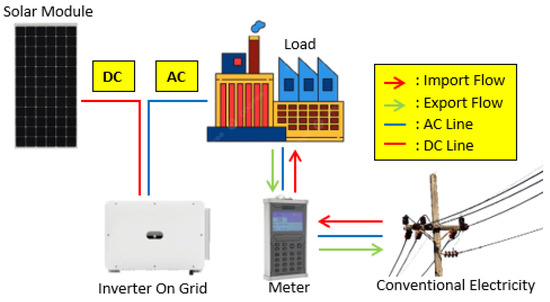 Moreover, the on-grid rooftop photovoltaic (Figure 2) arrangement is chosen for its appropriateness for uninterrupted industrial activities. In contrast to off-grid systems that necessitate costly battery storage, the on-grid architecture directly links to the public power grid, facilitating immediate utilization of solar energy and effortless integration with current factory systems [16]. In the utilities section of the case study, the system is integrated via a Change Over Switch (COS) network, which was selected over the Static Transfer Switch (STS) to protect production lines from instability during switching events [17].