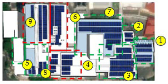 Notwithstanding the optimistic prospects, space constraints hinder the comprehensive implementation of rooftop photovoltaic systems in the FMCG case study plan [18]. The available roof surface is inadequate to accommodate a system that can fulfill the factory’s whole energy requirement, which surpasses 200,000 kWh per month [19]. This study concentrates on the utility area, an essential support zone comprising chillers, compressors, lighting systems, and auxiliary pumps to mitigate this constraint. This location was deliberately chosen due to its significant contribution to daily electricity consumption (about 6982 kWh) and its relative insensitivity to brief switching delays compared to production lines. By focusing on the utility area, the rooftop photovoltaic system can optimize the integration of renewable energy within current spatial constraints, diminish reliance on grid electricity, and maintain continuous production in essential manufacturing processes [20].