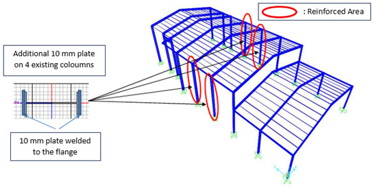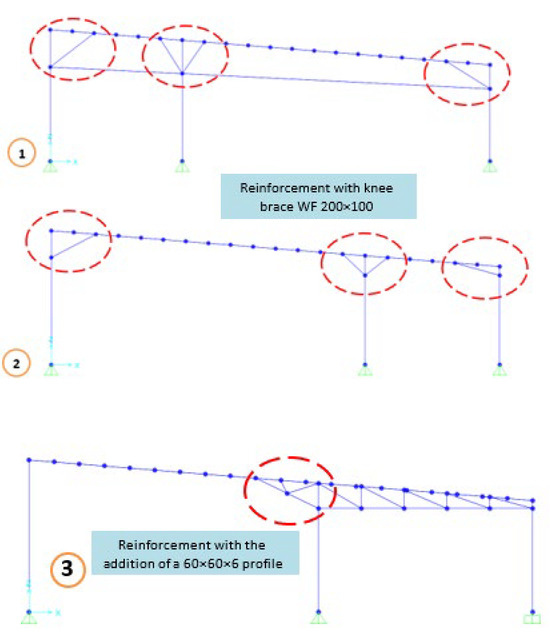 Figure 8 illustrates the structural reinforcement plan for critical elements, employing two primary methods: the use of knee braces and angle profiles. (2L). In the first part, reinforcement is carried out by adding a knee brace using a WF200 × 100 profile, which serves as a diagonal element to connect the horizontal beam with the vertical column [36]. This reinforcement aims to increase the stiffness and stability of the structure, especially at critical points marked with red circles. In the second part, the same reinforcement method is applied, but at more points to provide additional stability to the structure that requires greater support. Meanwhile, in the third section, reinforcement is carried out by adding a 2L 60 × 60 × 6 profile, which is an “L”-shaped angle profile installed in certain areas to provide additional stiffness to horizontal or diagonal elements. The installation locations of these profiles are also marked with red circles. Overall, this image illustrates a structural reinforcement strategy by utilizing knee braces and angle profiles to enhance the strength, stiffness, and stability of the structure, thereby enabling it to withstand additional loads and ensuring the safety of the building.