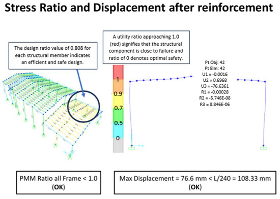 Figure 5 illustrates the structural analysis of the building after reinforcement has been implemented. The diagram on the left represents the distribution of the stress ratio, also known as the PMM (P-M-M Ratio), on the building frame elements [33]. The colors in the diagram indicate the level of utilization of the structural element’s capacity, where the green color signifies a safe utilization ratio (<1.0). The analysis results show that all frame elements have a PMM Ratio below 1.0, which means that the structure is in a safe condition and capable of withstanding the applied load.