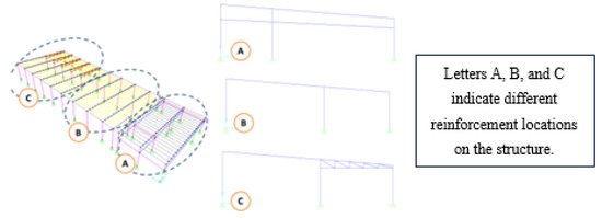 Figure 7 illustrates the strengthening design concept for Building Structure 9. The central diagram on the left shows a 3D model of the building structure with areas requiring reinforcement marked by dashed circles labeled A, B, and C. This model provides an overview of the structural elements that will be reinforced to enhance their stability and strength. On the right, three detailed sections illustrate the structural elements to be reinforced. Label A illustrates reinforcement on the central vertical elements, including columns. Label B shows reinforcement on the horizontal aspects, such as beams, in the middle of the structure, and Label C shows the addition of truss or frame elements to increase the rigidity and stability of the structure. This reinforcement aims to ensure that the structure in building nine can withstand additional loads or meet new design standards, particularly if there are changes in function or an increase in load capacity [35]. With this reinforcement design, the structure is expected to exhibit improved strength and stability, meeting the specific needs.