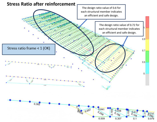 Figure 9 illustrates the distribution of stress ratios in the reinforced structure. The colored diagram uses a color scale to depict the stress ratio values, where red indicates a ratio approaching the maximum limit (1.0), and green or blue indicates lower values, showing that the structure is within safe limits. The text “Stress Ratio Frame < 1000 (OK)” suggests that all frame elements have a stress ratio below 1, which means the structure has been adequately reinforced and is in a safe condition against material failure. The additional diagram at the bottom shows the stress ratio details for various structural elements.