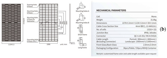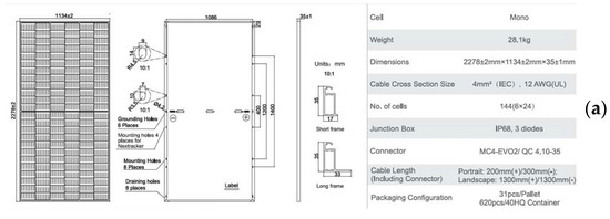This solar power system will consist of two types of photovoltaic (PV) modules: 681 units of the first solar module type and 395 units of the second solar module type, both of which are newly acquired [37] (Figure 10). The average peak power output of these modules is approximately 540 Wp and 560 Wp, respectively. In total, 1076 modules will be installed, with a combined installed capacity of roughly ±599 kWp.