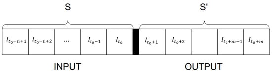 In the present work, the forecasting framework consists of multi-step sky image prediction. The whole concept is to create a model that takes a sequence of n consecutive sky images and returns a sequence of the next m sky images (Figure 1). In Figure 1, is the time of the forecast issuing, is the sky image at , S is the sky image sequence used as input, and S’ is the forecasted sky image sequence.