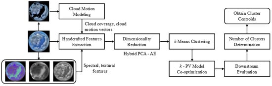 The total 49 handcrafted features are encoded into a reduced set of 15 latent features using a hybrid dimensionality reduction technique that combines Principal Component Analysis (PCA) and shallow, fully connected feed-forward AEs. The fully connected AE is symmetrical and contains a single hidden layer []. The resulting latent feature set is then clustered using k-Means clustering. The optimal number of clusters is identified through a novel forecast-driven strategy, which co-optimizes k with a minute-scale PV energy yield forecasting model—leveraging PV generation data associated with the sky images—and subsequent downstream evaluation. More details on the employed sky image classification approach can be found in [].