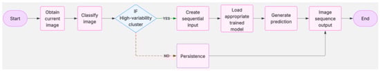 The prediction process begins with the classification of the current sky image into a suitable cluster, according to the classification method that is thoroughly described in Section 3.4.3 []. Afterwards, if the cluster belongs to the first category (high variability), the associated trained AE-like CNN model is called; otherwise, the persistence method is used instead. Then, the prediction implementation takes place and finally the future sky image sequence is extracted. The flow chart of the proposed sky image prediction process is illustrated in Figure 7.