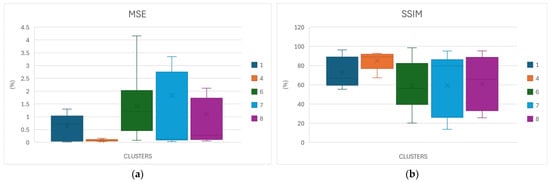 Per-cluster performance metrics (PSNR, MSE, and SSIM) for the proposed 8-Cluster AE-like CNN model.