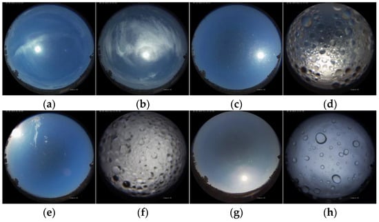Representative sky image samples per cluster derived from the proposed clustering approach for the second case study: (a) Clear sky with limited broken clouds (Cluster 1); (b) Thin cirrus clouds (Cluster 2); (c) Clear sky (Cluster 3); (d) Raindrops—sun not blocked (Cluster 4); (e) Sunrise (Cluster 5); (f) Raindrops—sun blocked (Cluster 6); (g) High turbulence (Cluster 7); (h) Overcast (Cluster 8).