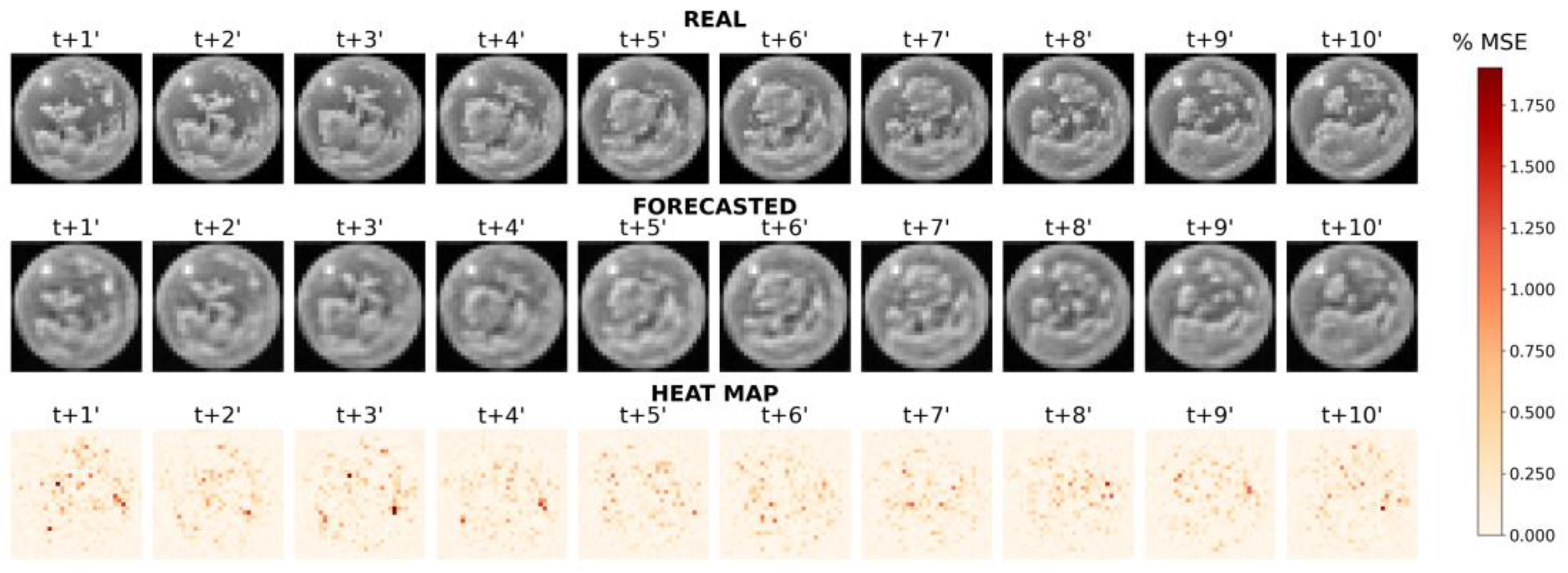 Figure 10, examples of generated sky image forecasts are depicted for clusters 6 and 8, respectively. For each figure, the first row illustrates the real sequence, the second row the forecasted one and the third is a heat map that visualizes the MSE for each pixel between the two images. In these two examined cases, different color bar scales are applied to the heat maps to ensure that the variations in error are clearly distinguishable. Comparing the forecasted sky images to the real ones, it is obvious that the cloud distribution and coverage ratio have been accurately modeled, and the model has also correctly predicted whether the sun is blocked or not. Even in the case of Cluster 8, where more pronounced variations are present, the model was able to predict them with high accuracy. By observing the heat maps, it becomes clear that the model has achieved its objective, since the heat maps are mostly white—indicating low MSE values—with a few isolated red patches that reveal localized error spikes.