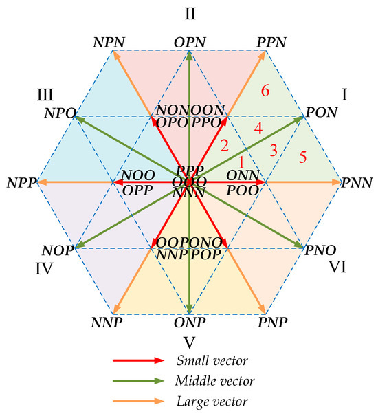 It is important to highlight that the mid-point voltage balancing issues should be considered during the modulation for this NPC-3-L inverter. The zero vectors and large vectors do not affect the mid-point voltage. The impact of the medium vectors on the mid-point voltage is uncertain, and the small vectors can be further divided into P-type and N-type small vectors, which exert opposite effects on the mid-point voltage deviation. Therefore, in the subsequent switching sequence allocation, the effect of the mid-point voltage deviation can be controlled by adjusting the dwell time of P-type and N-type small vectors.