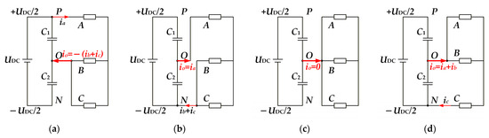 For example, when the vref falls into Sector I-1, the participating vectors are the zero vector OOO, and small vectors POO, ONN, and OON, where POO and ONN are redundant small vectors. Their effects on the mid-point voltage are shown in Figure 4.