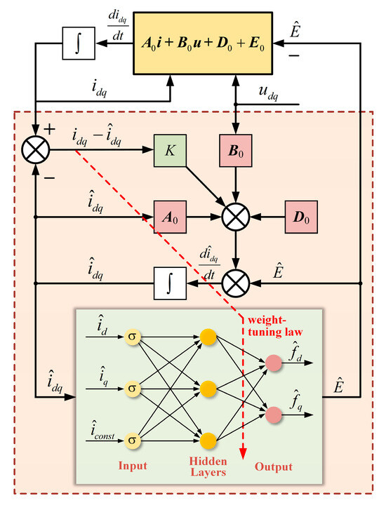where i, u, and D0 are the vector of stator current, voltage, and back electromotive force, respectively. It is important to highlight that E0 from parameter mismatches and other disturbances can be estimated with an NN-based disturbance observer, proposed in Section 4. The vectors above are described as