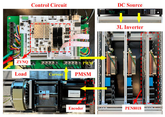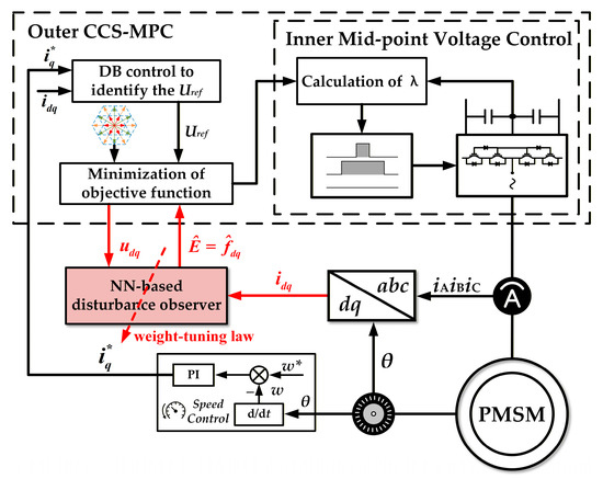 Permanent magnet synchronous motors (PMSMs) have been increasingly adopted in high-power applications due to their high efficiency, high power density, low torque ripples, and small volume and weight [1,2,3,4]. In parallel, multilevel inverters, particularly the neutral-point-clamped three-level (NPC-3L) topology, have emerged as a cornerstone technology for medium-voltage, high-power motor drives, as they reduce both current and voltage stress on power devices, mitigate torque ripple, and enhance fault-tolerant capability [5]. Nevertheless, the NPC-3L inherently suffers from mid-point voltage imbalance in its dual-capacitor DClink, which significantly constrains the inverter’s ability to generate a symmetric AC voltage and thus degrades overall drive performance and reliability. To address the strong nonlinearities of PMSM systems, model-predictive control (MPC) has garnered substantial academic and industrial interest because of its intuitive control structure, design flexibility, and fast transient response [6,7,8,9]. Within the MPC framework, finite-control-set MPC (FCS-MPC) and continuous-control-set MPC (CCS-MPC) each offer distinct benefits. FCS-MPC is simpler to implement but generates considerable current harmonics [10], whereas CCS-MPC can synthesize a complete voltage vector, resulting in superior harmonic suppression and thereby enhancing steady-state performance [11]. Despite these advantages, both FCS-MPC and CCS-MPC depend heavily on accurate motor model parameters. In practice, PMSM parameters such as stator inductance and flux linkage vary with temperature and operating conditions, and cannot be measured directly in real time [12,13]. Consequently, parameter mismatches degrade MPC drive performance, causing higher steady-state current error or torque ripple [14]. Therefore, mitigating or compensating for MPC’s sensitivity to model inaccuracies remains the primary technical challenge for practical CCS-MPC implementation [15,16].