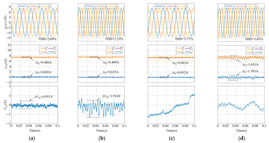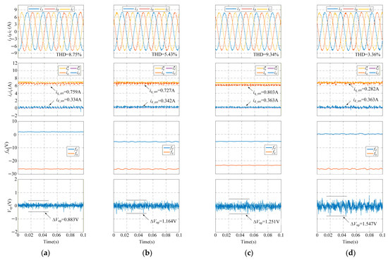 The steady-state performance of CCS-MPC with active control (dynamic calculation of λ) and passive control (λ fixed at 0.5) of mid-point voltage. (a) Active control under 500 rpm; (b) active control under 800 rpm; (c) passive control under 500 rpm; (d) passive control under 800 rpm.