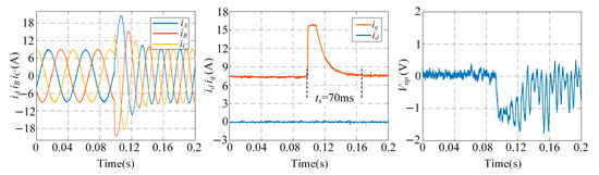As shown in Figure 12, when L = 0.6L0, the steady-state error of the d-axis current decreases from 0.789 A to 0.265 A, with the lumped error terms fd and fq stabilizing at −7.8 V and −17.4 V, respectively. When L = 1.4L0, the steady-state error of the d-axis current reduces from 0.470 A to 0.247 A, and fd and fq stabilize at −11 V and −18.1 V, respectively. When ψf = 0.6ψf0, the steady-state error of the q-axis current decreases from 0.688 A to 0.264 A, with fd and fq stabilizing at −18.7 V and −22.8 V, respectively. When ψf = 1.4ψf0, the steady-state error of the q-axis current decreases from 0.643 A to 0.282 A, with fd and fq stabilizing at −2.9 V and −12.5 V, respectively.