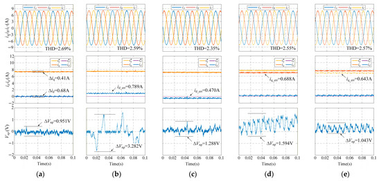 As shown in Figure 9, under CCS-MPC cascade control of the mid-point voltage, the total harmonic distortion (THD) values of currents in phases A at motor speeds of 500 rpm and 800 rpm are 2.69% and 2.53%, respectively. The d-axis current ripples amplitudes are 0.620 A and 0.635 A, while the q-axis current ripples amplitudes are 0.486 A and 0.489 A, respectively. Compared with the passive control (with λ fixed at 0.5) of the mid-point voltage, the mid-point voltage ripple is significantly reduced under active control, with peak-to-peak ripple values of 0.9 V and 1.8 V at 500 rpm and 800 rpm, respectively. In contrast, passive control leads to a substantial deviation in the mid-point voltage, which subsequently increases the phase current THD and the dq-axis current ripples to a certain extent.