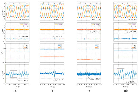 The steady-state performance of CCS-MPC with sliding mode disturbance observer under different parameter mismatch conditions (a) L = 0.6L0; (b) L = 1.4L0; (c) ψf = 0.6ψf0; (d) ψf = 1.4ψf0.