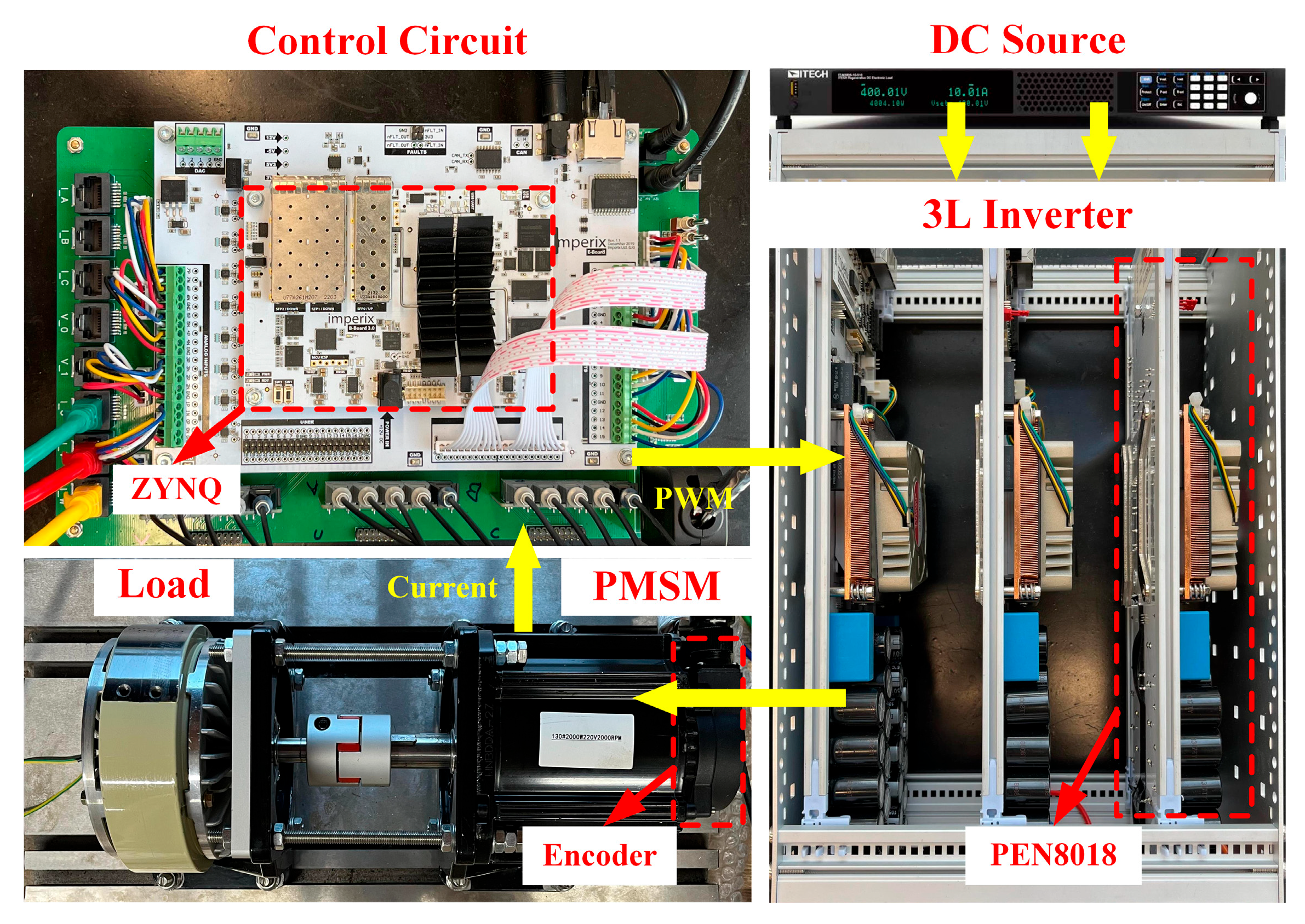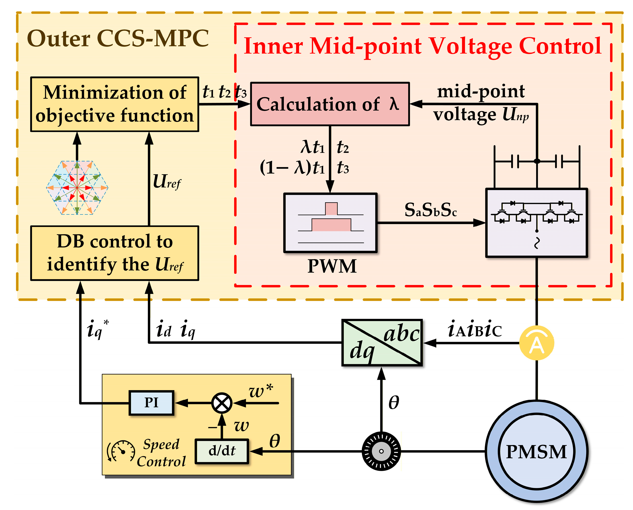 - Cascaded CCS-MPC with Mid-Point Voltage Control—The outer CCS-MPC loop formulates a quadratic program based solely on voltage–vector dwell times to minimize torque ripple and achieve precise current tracking. The inner loop dynamically balances the NPC-3L DC-link mid-point by adjusting P- and N-type small-vector dwell times.