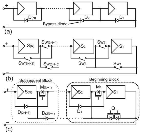 The schematic of (a) a number of N PV modules connected in series with bypass diode, (b) a number of N PV modules connected with switches that allow reconfiguration, and (c) the newly proposed PV array reconfiguration network implementation.