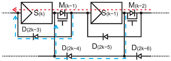 Figure 3 shows the current of a parallel connection. When MOSFET turned off, the diodes and will be correctly biased and become conducting. Note that the two PV modules and are connected in parallel, resulting in the currents directed through and as shown in the two blue arrow. These two PV modules are connected in series with the rest of the PV modules in the PV system.