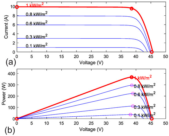 A typical current–voltage (I-V) and power–voltage (P-V) curve under different irradiance levels is shown in Figure 4. It is important to note that irradiance affects not only the short circuit current but also the output voltage when operating at low current. In Figure 4a, assuming the modules are currently outputting 3 A, the module receiving 1000 W/m2 has the highest voltage at approximately 44 V, while the modules receiving 800, 600, and 300 W/m2 provide only 43.5 V, 43 V, and 41 V, respectively.